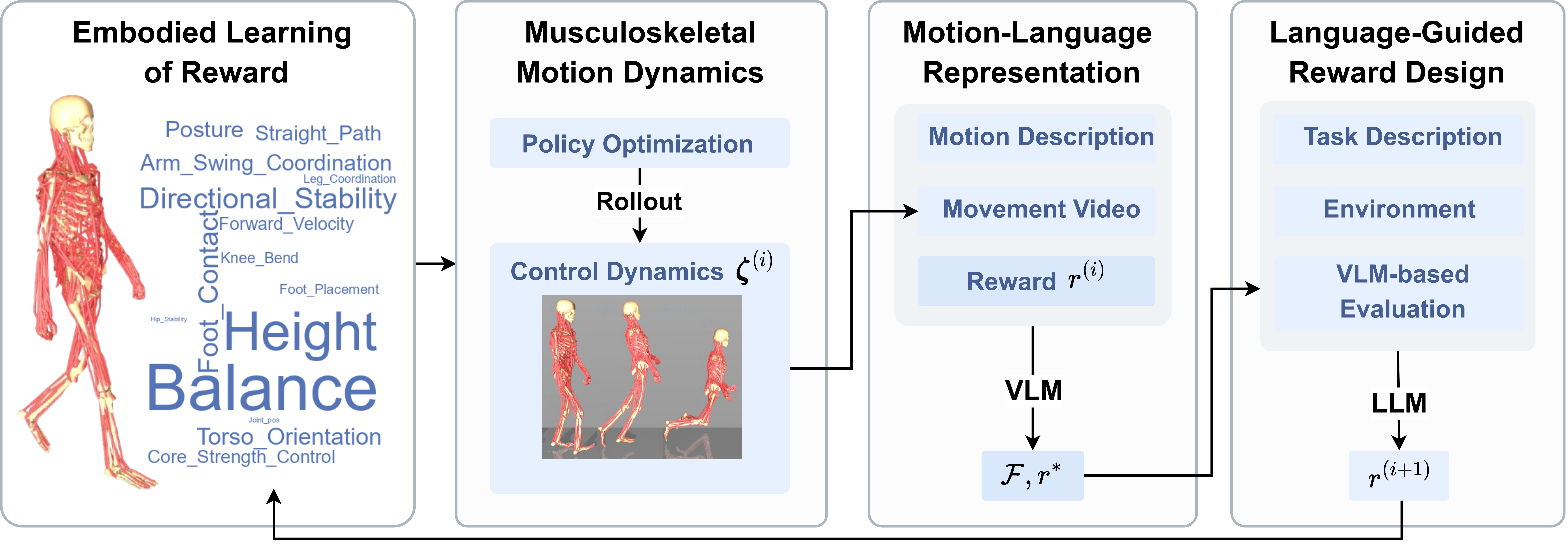 We present Motion from Vision Language Representation (MoVLR), which automatically learns rewards for high-dimensional musculoskeletal control by integrating both descriptive and dynamical feedback. MoVLR extracts high-dimensional musculoskeletal dynamics of candidate rewards via policy optimization and rollout. The resulting control dynamics are rendered into movement videos to provide dynamical feedback. A vision-language model then evaluates the agent's motion and produces structured biomechanical feedback, which is used by a LLM to refine the reward generation process.