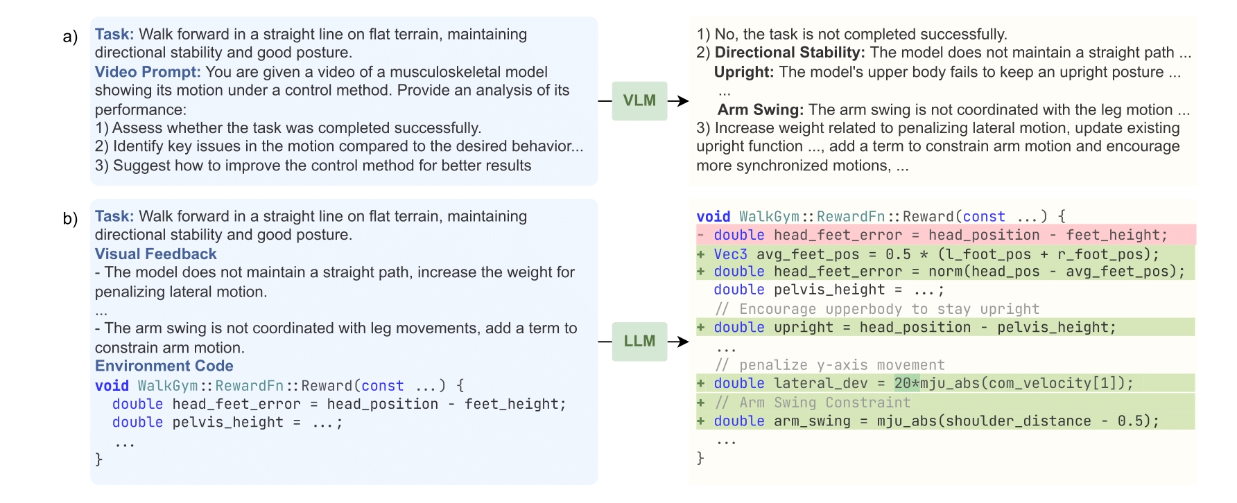 Example inputs and outputs of the (a) VLM, and (b) LLM. The VLM analyzes a video motion sequence based on the given motion description and provides diagnostic feedback. The LLM uses this feedback to design corresponding code modifications to the reward function.